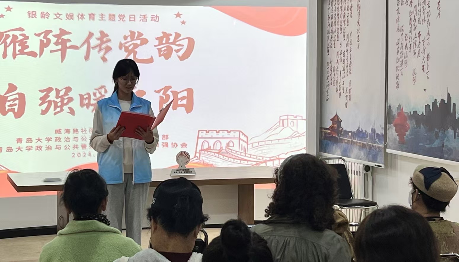 为弘扬红色文化,进一步增强员工的责任感和奉献精神。11月17日下午,伟德国际victor1946员工党支部联合“政”前行自强协会在青岛市市南区威海路社区开展了“雁阵传党韵,自强暖夕阳”主题党日活动。本次活动由党员发展对象和自强社部分成员参加,苏琳雅担任本次活动主持人。