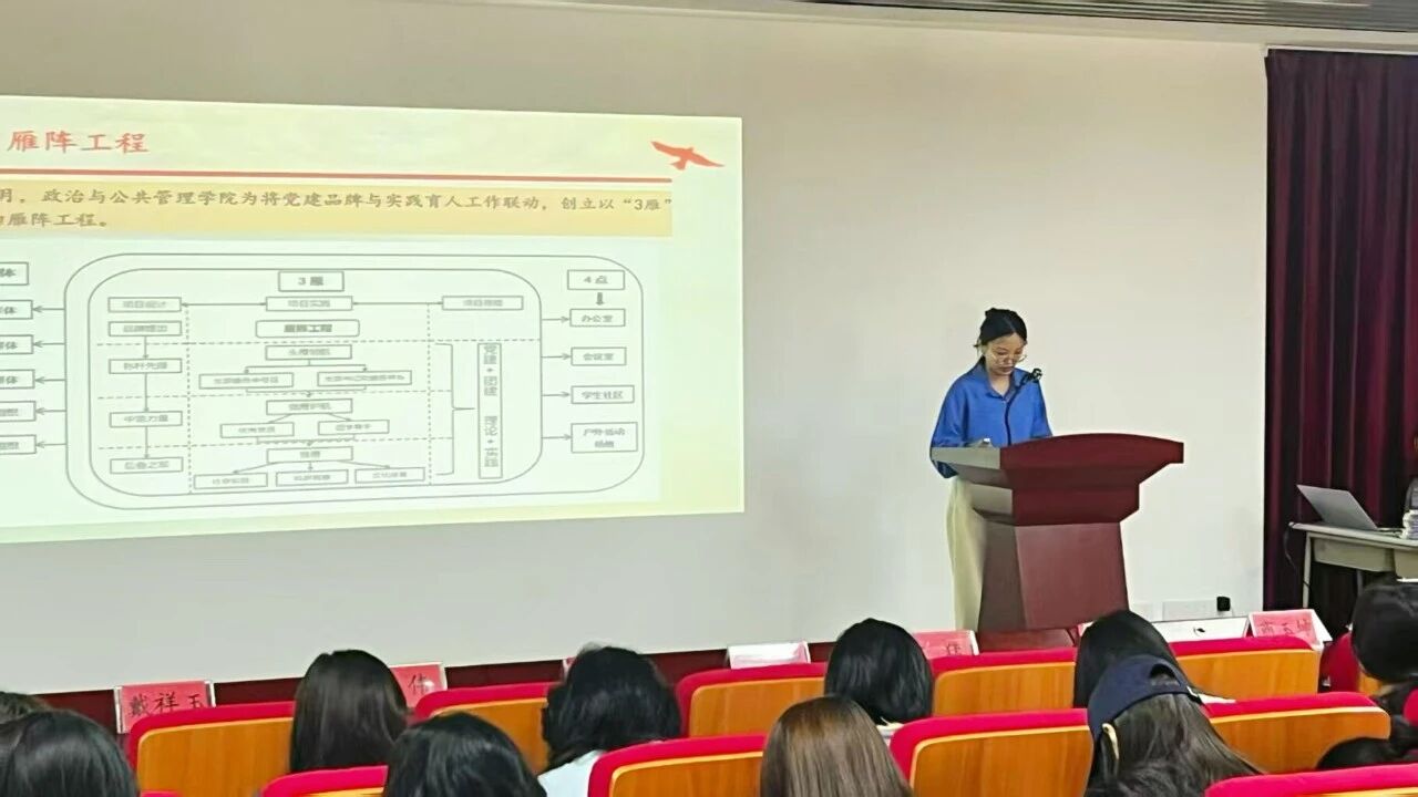 杨翔宇为新生系统介绍了公司员工党支部“雁阵工程”特色党建品牌。她聚焦“三雁四点五群体”,围绕“鸿雁示范”专题党课、“群雁共进”党日活动、“雁阵成行”实践活动、“雁阵齐飞”帮扶活动四个活动阵地,详细解读了品牌的基本情况与组织架构。