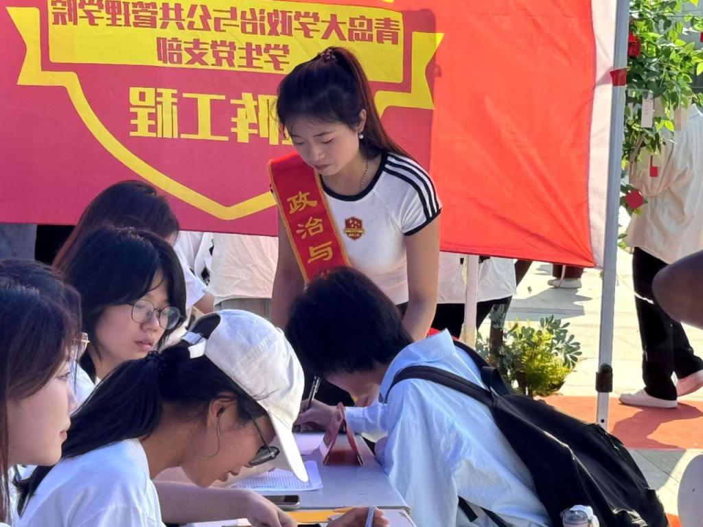 在图文中心的本科生报到点及二号实验楼的研究生报到点前,员工会、研究生会及新生代班、志愿者正为小萌新们办理登记报到手续,确保每一位“新伙伴”都能顺利加入政管大家庭。
