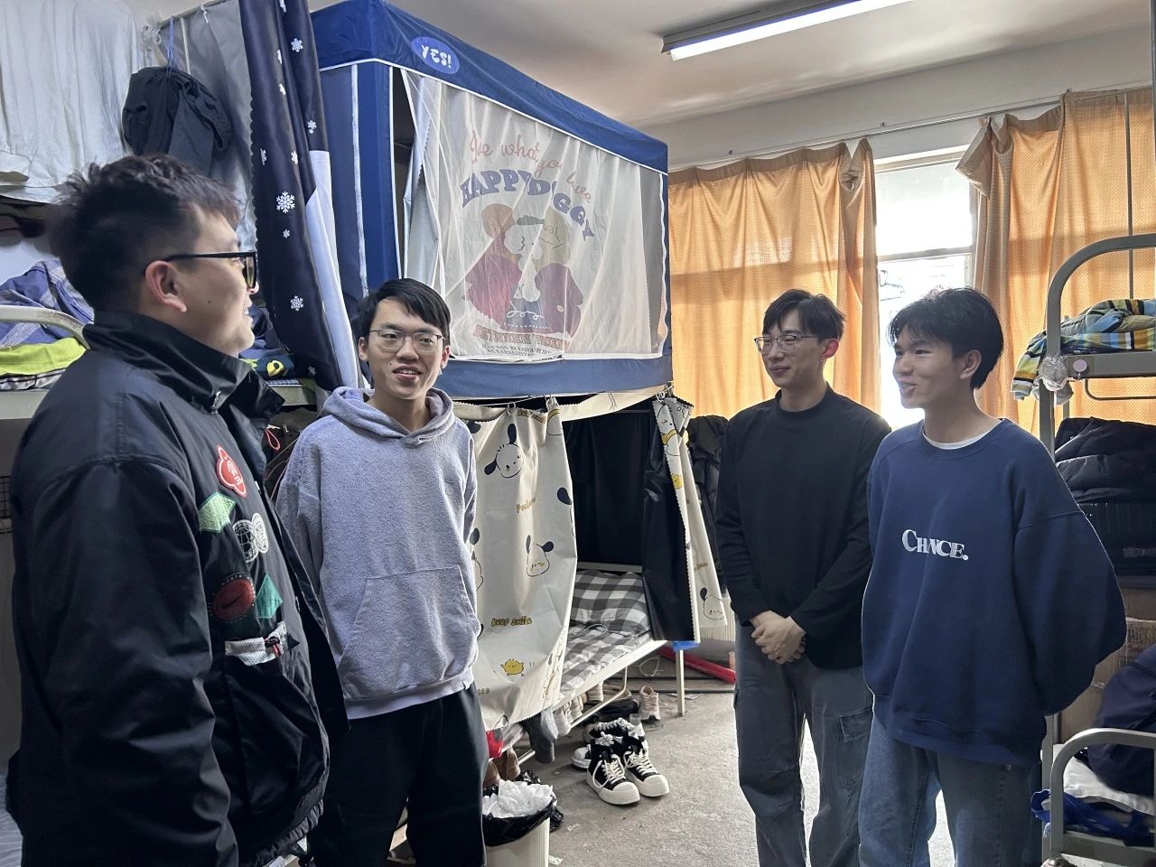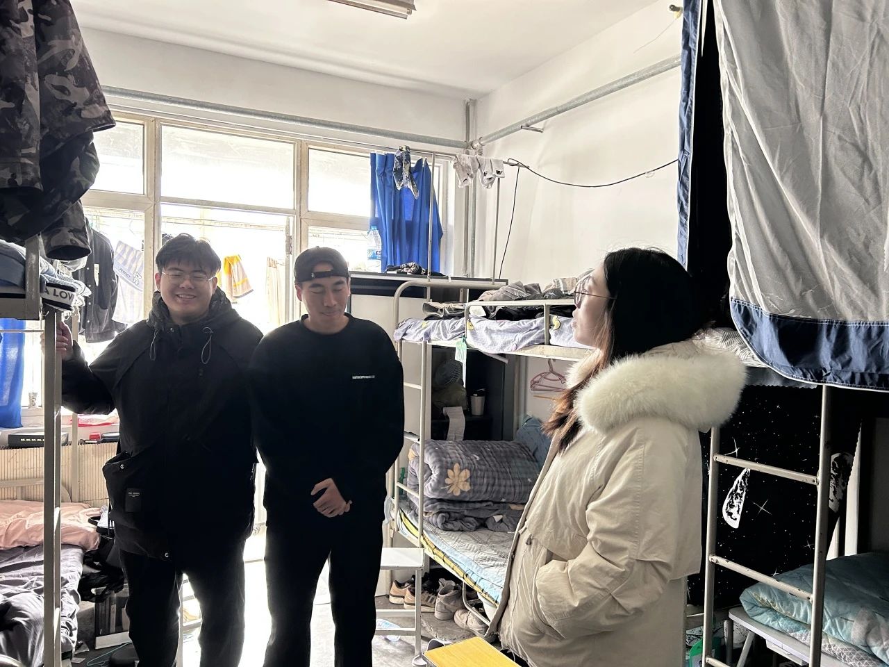 辅导员老师张伟、王嘉伟、商玉坤走访员工宿舍,重点检查消防设施与用电安全。老师们详细询问同学们返校后的生活学习状况,提醒员工做好开学季传染病预防工作,强调“人走断电”、“宿舍禁烟”等安全事项。