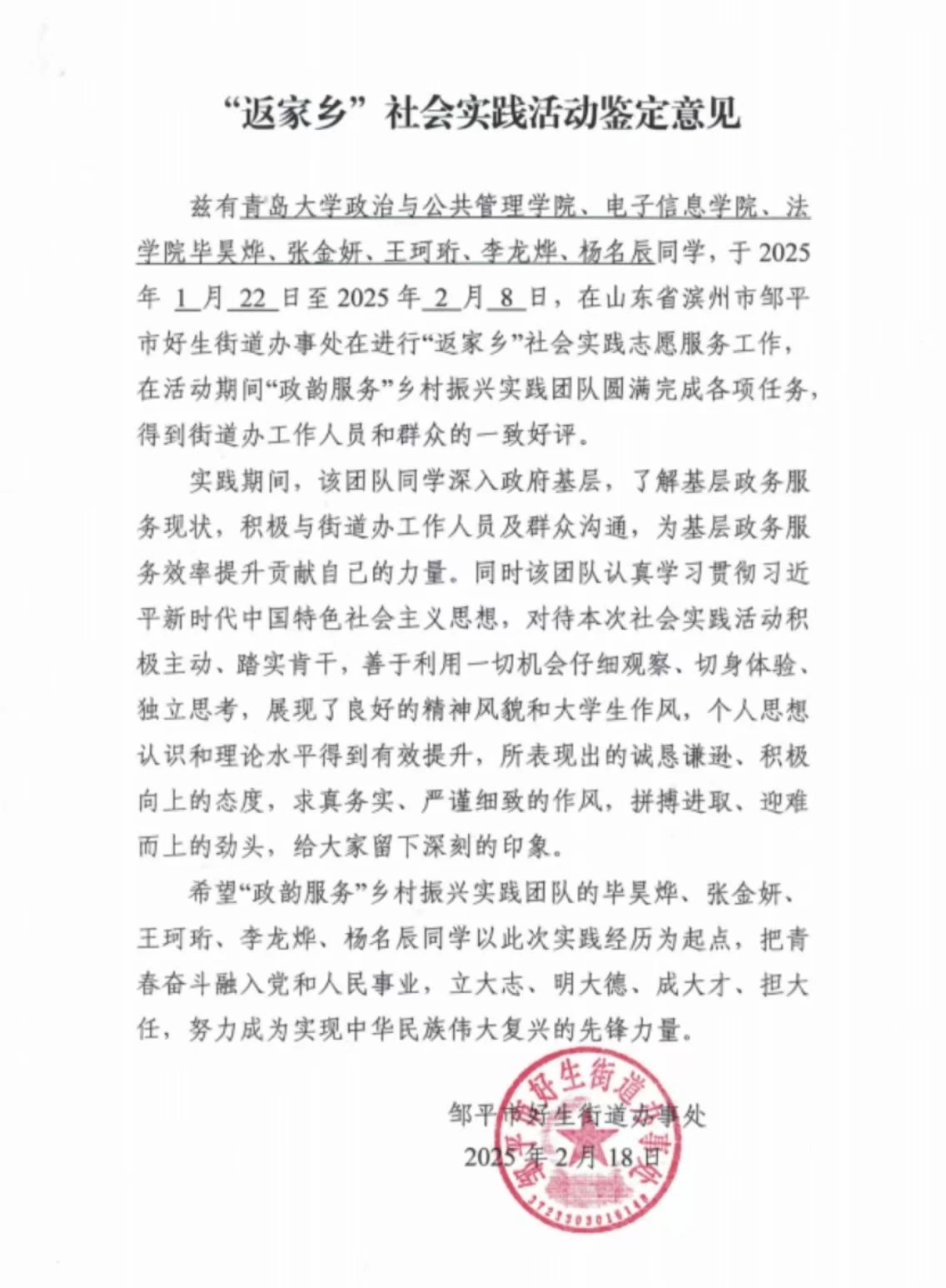 由伟德国际victor1946、物理科学公司、化学化工公司员工组成的少年“政”有为乡村振兴调研实践团,于2025年寒假深入山东省莱西市产芝村进行了为期10天的实地调研,全面认识了习近平总书记扎实推进乡村全面振兴的思想,深刻领悟了地方特色资源与乡村农家乐相结合对于促进乡村振兴发展的重要意义,采用了问卷调查、无结构访谈、半结构访谈、观察调查等社会科学研究方法,收获满满。(主要负责人:曲芸 团队成员:高圣淇,李欣茹,曹童禄)