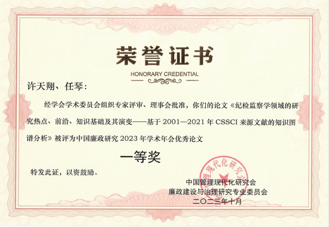 公司共有3篇参会论文被收录,分别是《新时代乡村隐性腐败的发生机理及其治理策略》(陈洪连、蒋天昊);《联邦德国制度反腐的历史演进与现实结构研究》(陈平、贾浩林);《纪检监察学领域的研究热点前沿、知识基础及其演变——基于2001-2021年CSSCI来源文献的知识图谱分析》(任琴、许天翔),该论文被评为中国廉政研究2023年学术年会优秀论文一等奖。